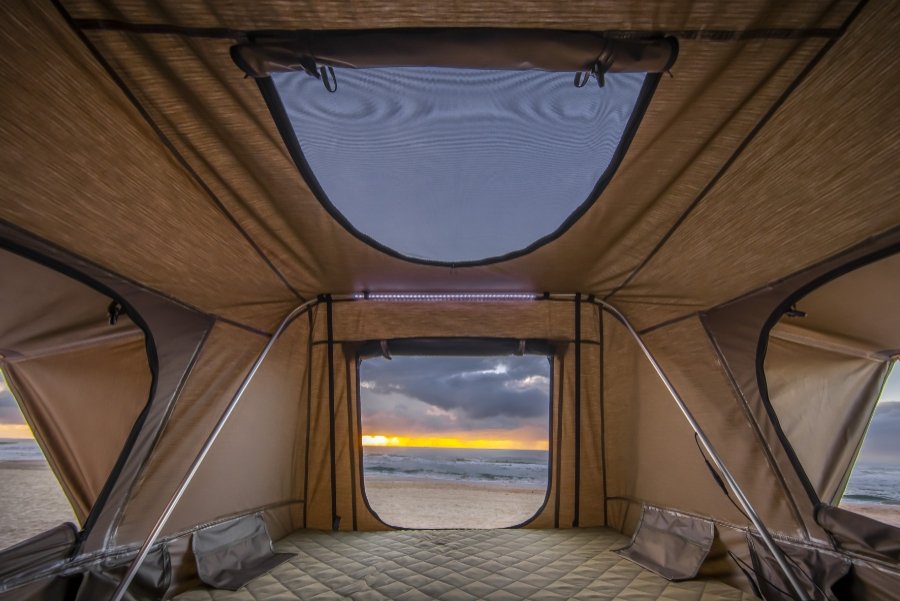 Tente de toit Swisskings 190L avec structure aluminium, ouverture rapide en 90 s, couchage pour 4 personnes et ventilation optimisée.