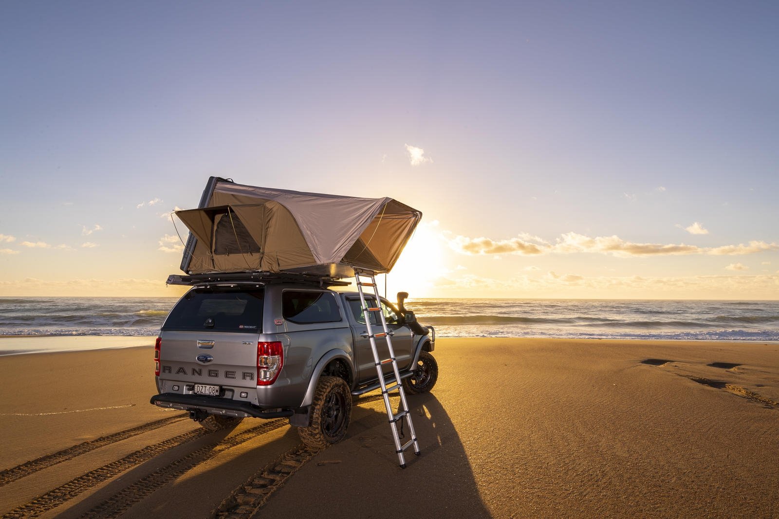 Tente de toit GoOverland Expedition XL avec coque aluminium nid d’abeille, matelas mémoire 200×200 cm, isolation thermique et accessoires inclus.