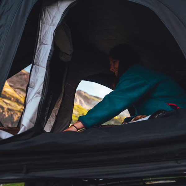 La tente de toit GoOverland Journey est une tente rooftop conçue au Canada, idéale pour les couples ou deux voyageurs souhaitant un campement léger et performant : sa coque en aluminium en nid d’abeille allie robustesse et légèreté, avec seulement 52 kg et 12 cm d’épaisseur fermée — l’une des tentes rigides les plus compactes du marché.