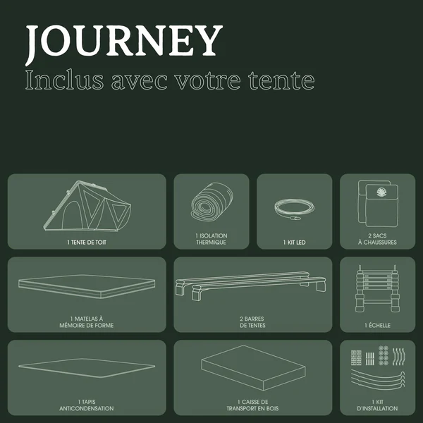 Livrée avec une multitude d’accessoires — isolation thermique intégrée, barres de tente, éclairage LED, échelle télescopique de 230 cm, sacs de rangement et kit complet d’installation — elle est prête à être installée sur la plupart des véhicules équipés de barres de toit transversales, ce qui facilite vos départs en aventure.