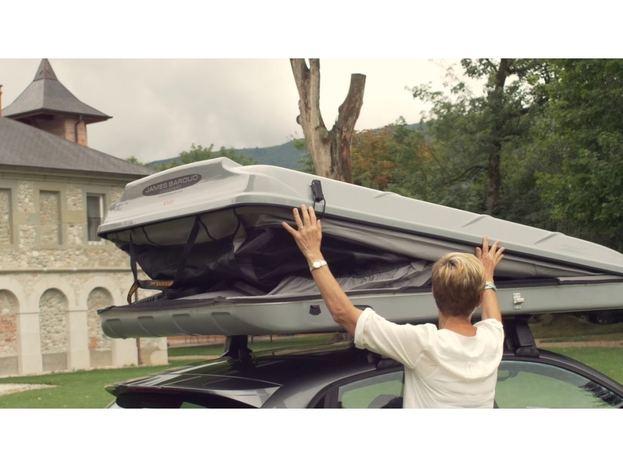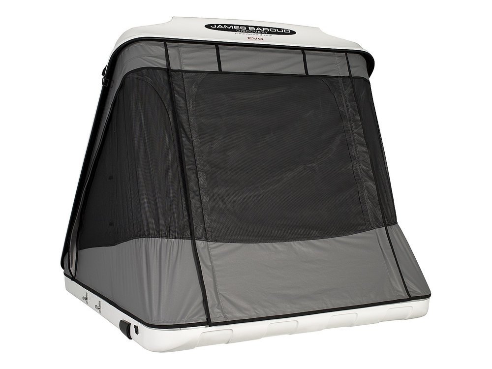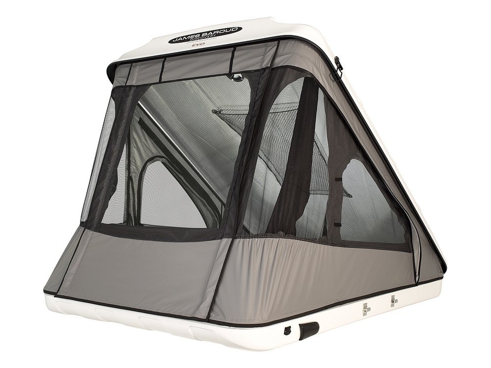 Tente de toit James Baroud Discovery M EVO avec coque rigide en fibre de verre, couchage 140×200 cm, ouverture assistée et toile imperméable respirante.