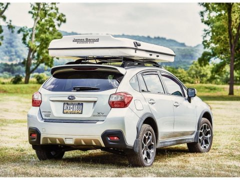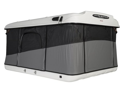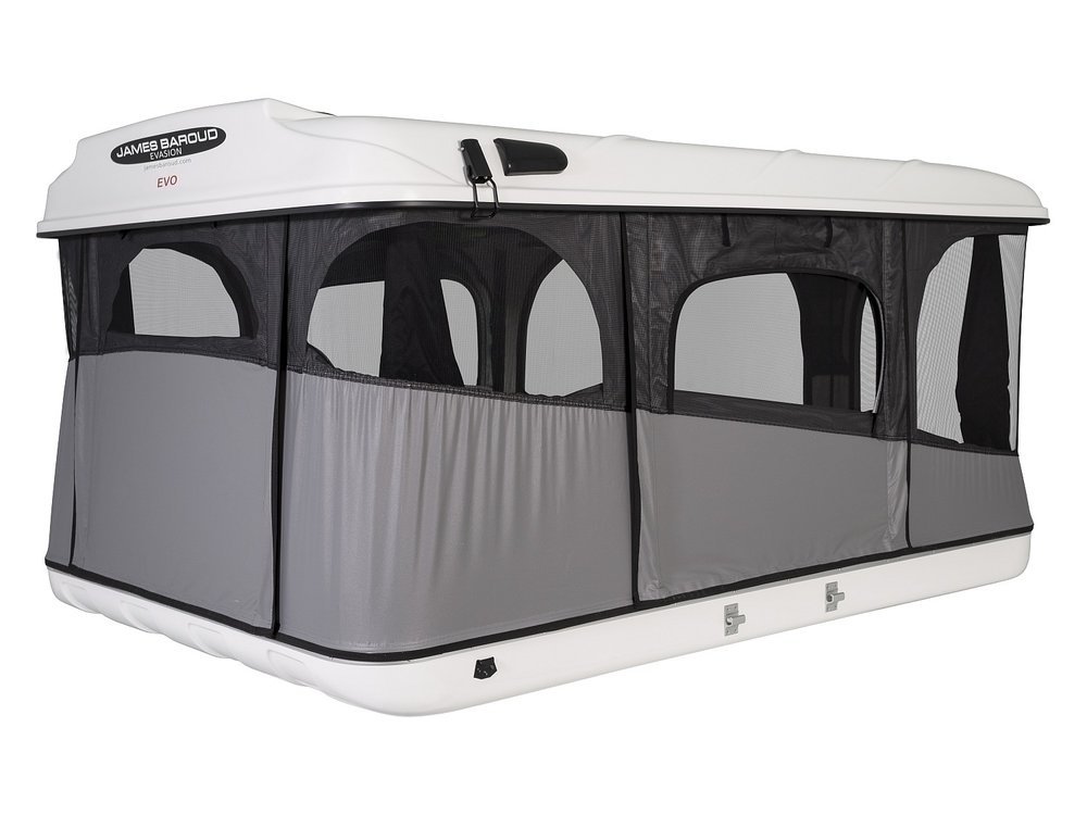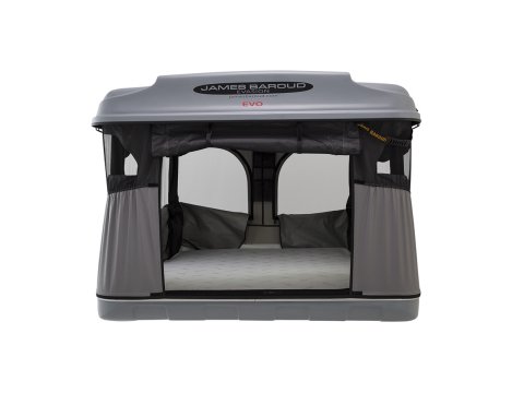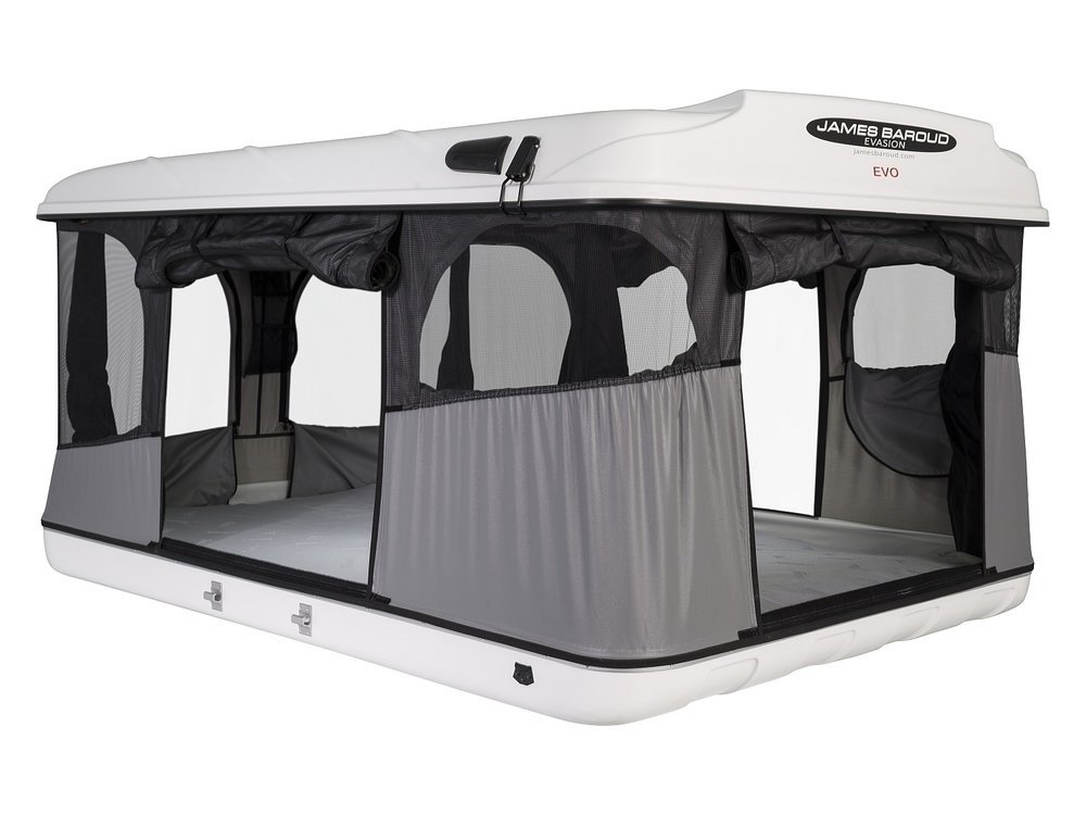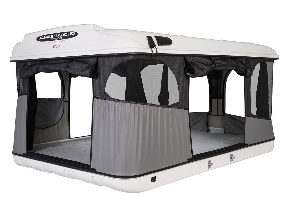 La tente de toit James Baroud Evasion M EVO combine une coque rigide en fibre de verre, ventilation solaire silencieuse, matelas haute densité et vues panoramiques pour un bivouac confortable.