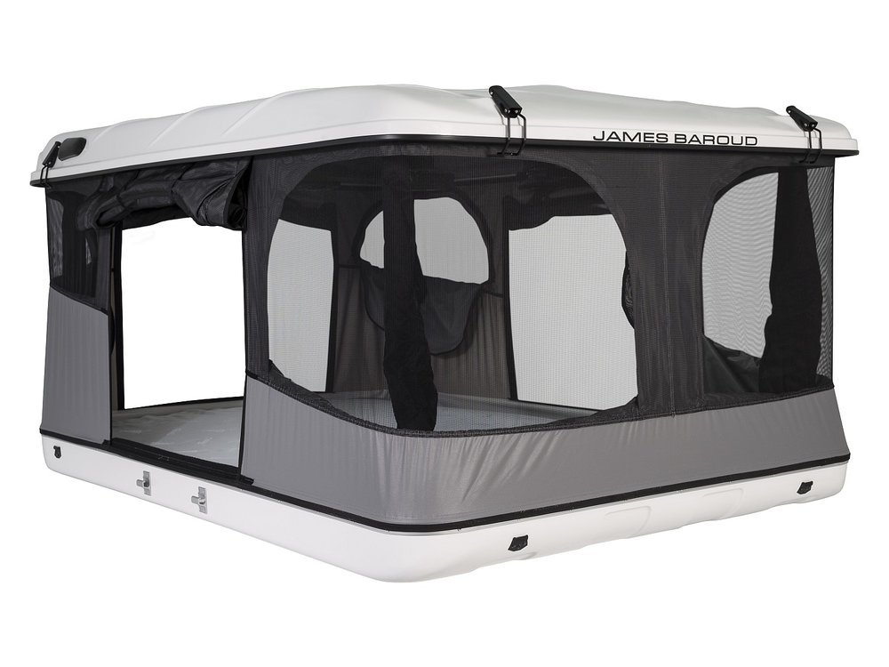 Tente de toit James Baroud Nova Frontier L avec coque rigide ABS 4 mm anti‑UV, vues panoramiques à 180° et matelas haute densité inclus.