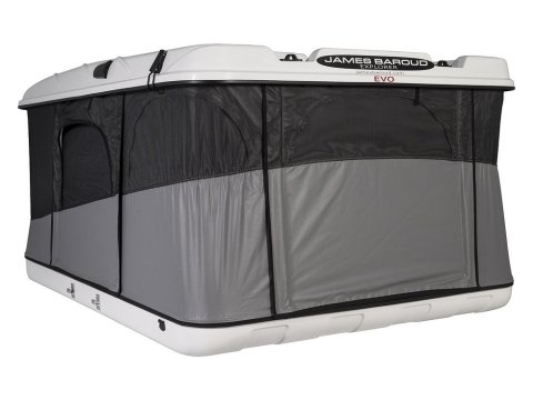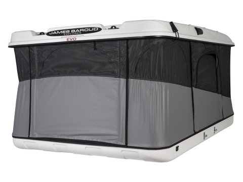 La tente de toit James Baroud Evasion M EVO combine une coque rigide en fibre de verre, ventilation solaire silencieuse, matelas haute densité et vues panoramiques pour un bivouac confortable.