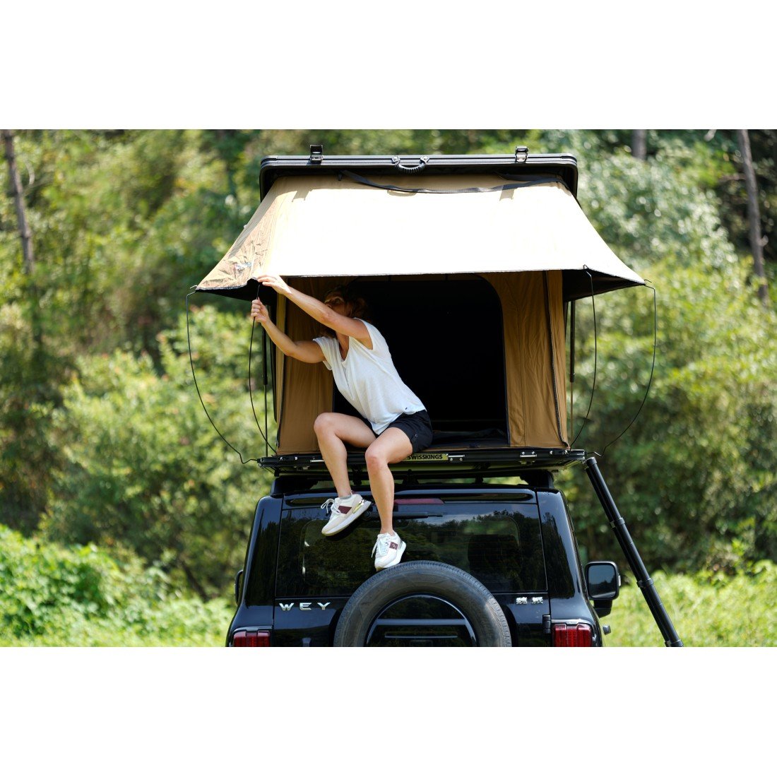 Tente de toit Swisskings 190L avec structure aluminium, ouverture rapide en 90 s, couchage pour 4 personnes et ventilation optimisée.
