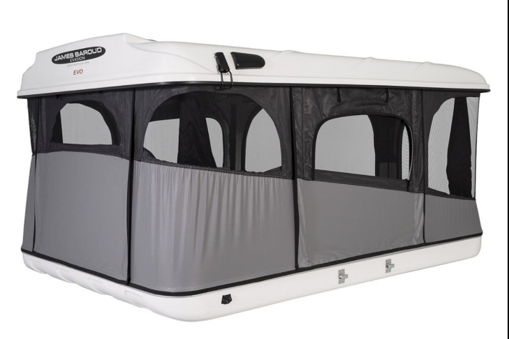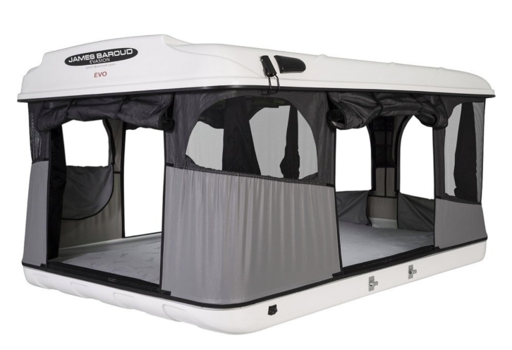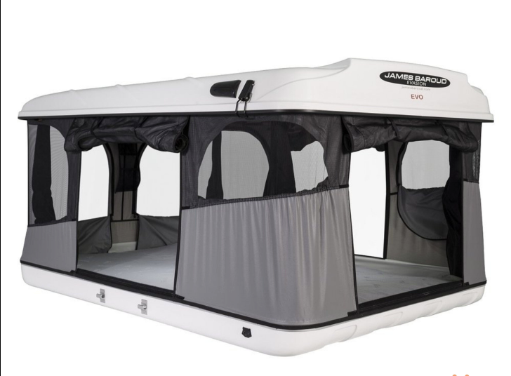 Tente de toit Evasion Evo de James Baroud, modèle à coque rigide en fibre, avec matelas haute densité, ventilation solaire et moustiquaires, conçue pour aventures et camping prolongé.
