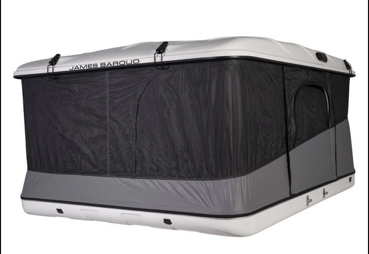 Tente de toit James Baroud Discovery M EVO avec coque rigide en fibre de verre, couchage 140×200 cm, ouverture assistée et toile imperméable respirante.